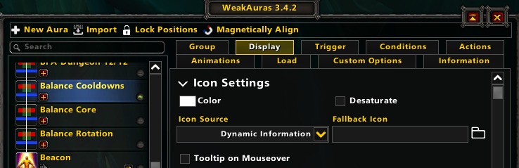 - Display: controls the appearance and positioning of a WeakAura in its default state. When a group is selected this affects all WeakAuras within the group.